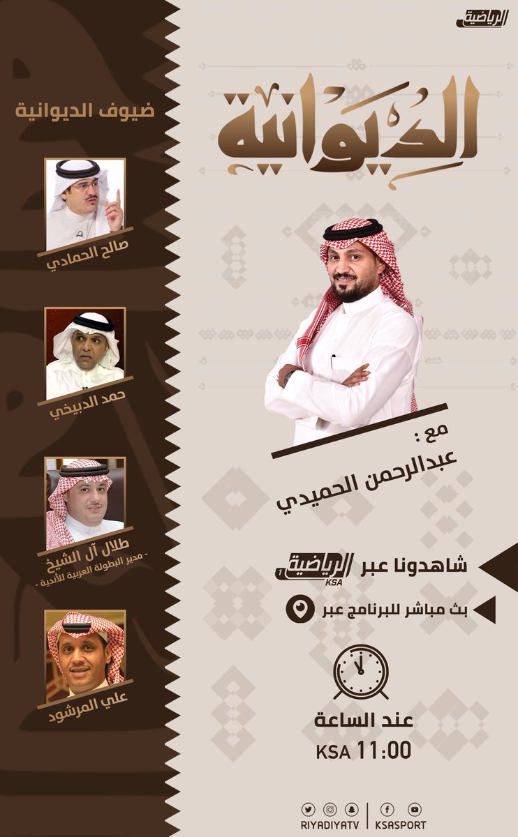 القنوات الرياضية السعودية On Twitter تشاهدون الليلة برنامج الديوانية مع A Alhameedi ويستضيف صالـح الحـمادي حـمد الـدبيخي طـلال آل الـشيخ عـلي المـرشـود كونوا على الموعد 11 00م الرياضية السعودية Https T Co Dskjtcess7