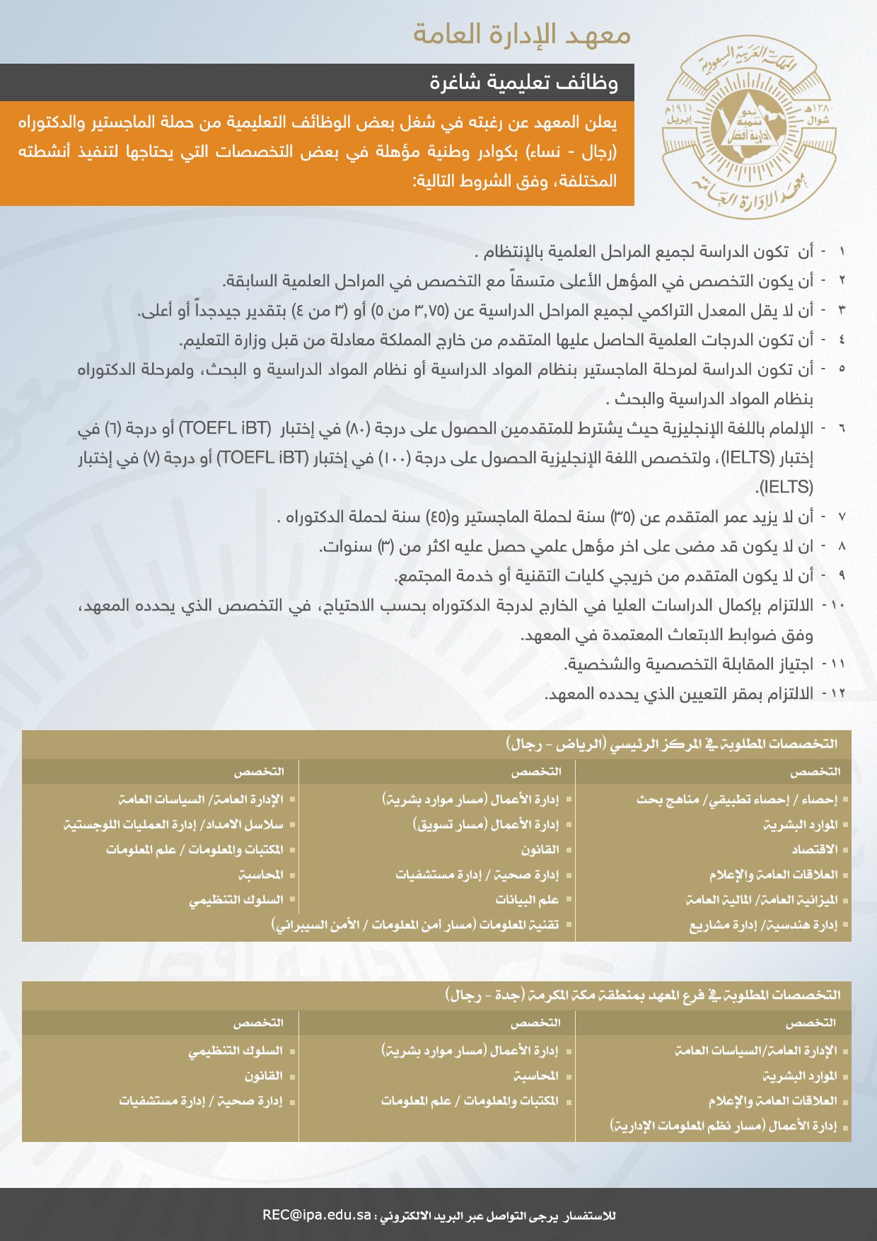 معهد الإدارة العامة Pa Twitter يعلن المعهد عن رغبته في شغل بعض الوظائف التعليمية بكوادر وطنية مؤهلة من حملة الماجستير والدكتوراه رجال ونساء في بعض التخصصات التي يحتاجها لتنفيذ أنشطته المختلفة ويمكن