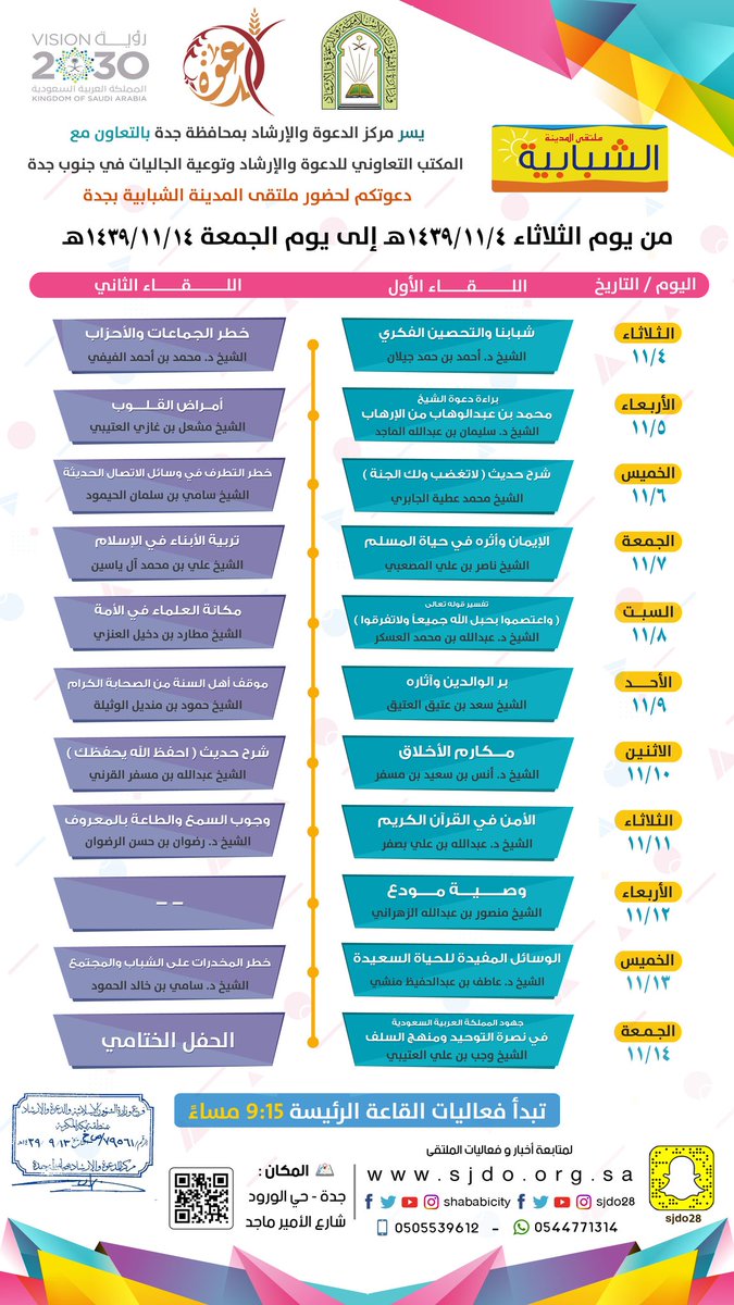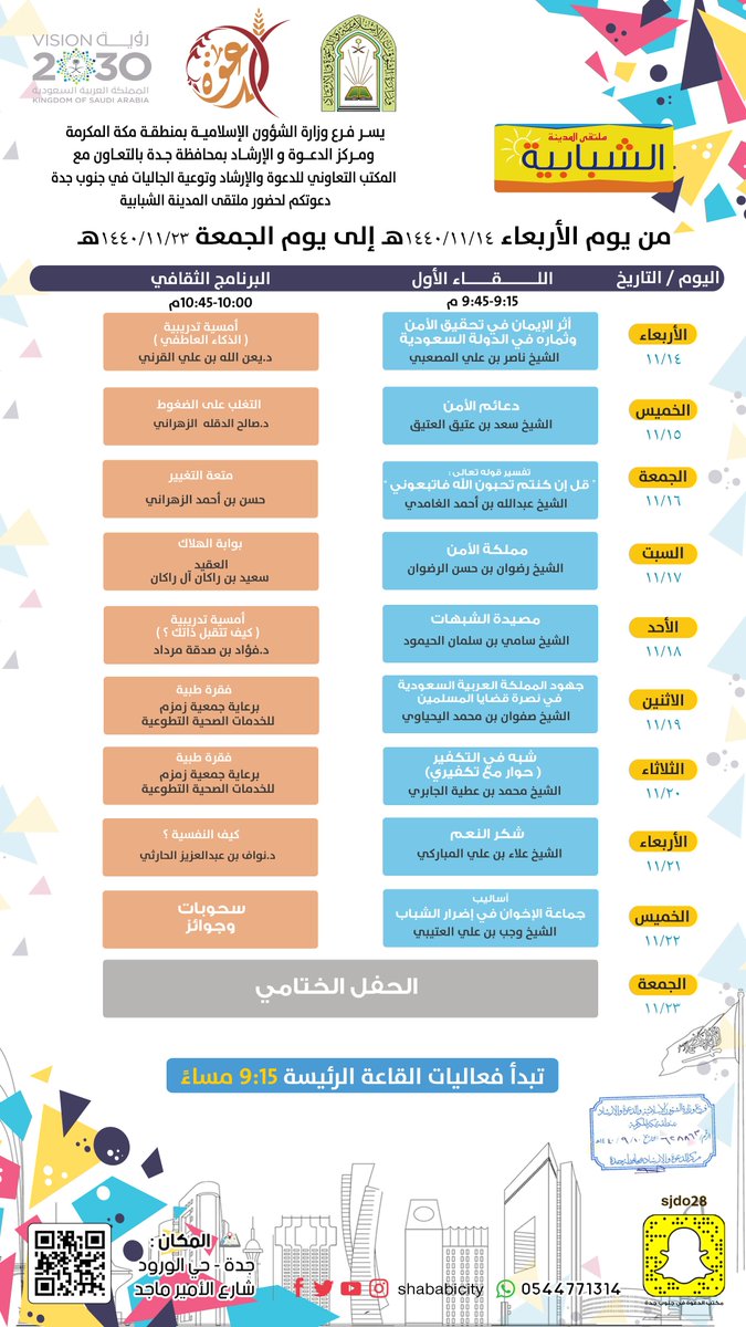 ملتقى المدينة الشبابية بجدة On Twitter يدعوكم مكتب دعوه جنوب جده لحضور ملتقى المدينة الشبابية بإشراف وزارة الشؤون الإسلامية Saudi Moia من الثلاثاء 11 4 إلى الجمعة 11 14 حي الورود شارع الامير ماجد السبعين Https T Co Xowqdkyf0f