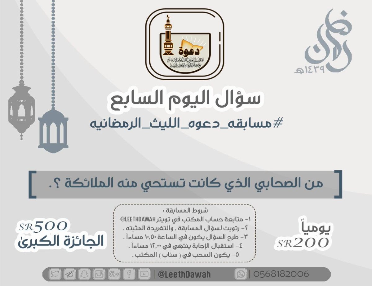 جمعية دعوة الليث On Twitter دعوه الليث مسابقه دعوه الليث الرمضانيه سؤال اليوم السابع من الصحابي الذي تستحي منه الملائكة ينتهي وقت استلام الإجابة في الساعة ٢ ١٥ بعد منتصف الليل وقف الوفاء Https T Co Tgzysggdmj