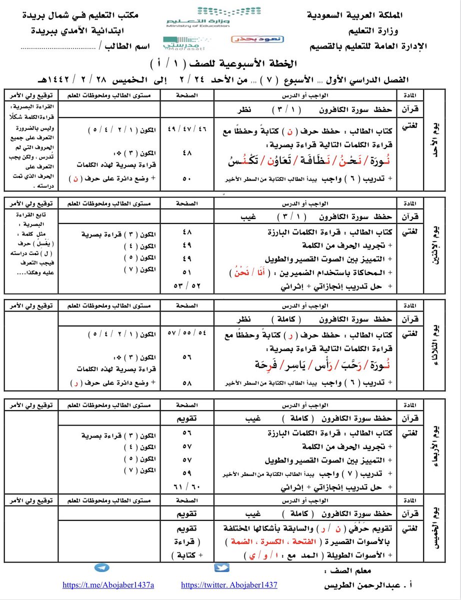 نموذج فارغ للخطة الأسبوعية للصف الأول ابتدائي 1442 الفصل الأول والثاني حل كتاب