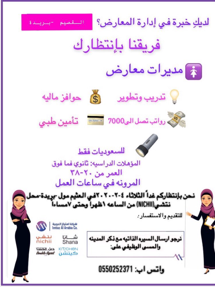 وظائف نسائيه بالقصيم On Twitter وظائف نسائية شاغرة بشركة امتياز العربية بمسمى مديرات معرض في بريدة للتقديم الحضور غدا الثلاثاء 4 2 2020 بالعثيم مول في بريدة بمحل نتشي من 1م حتى 7م Https T Co Lar7rypue4