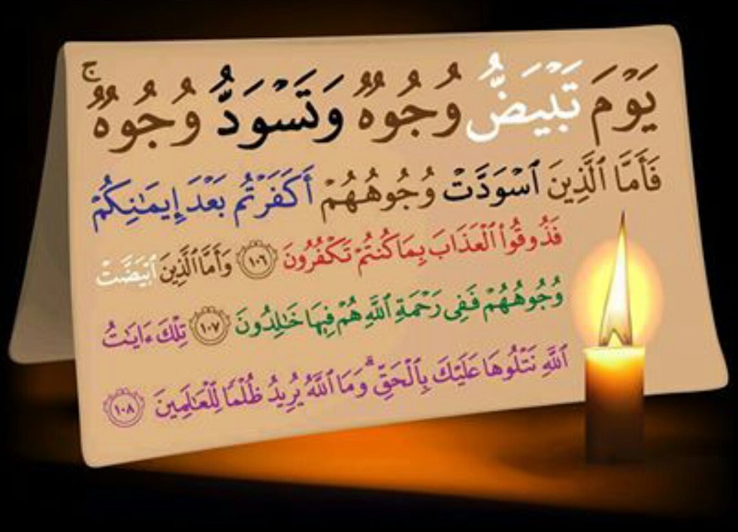 ١٠٦ آل عمران ي و م ت ب ي ض و ج وه و ت س و د و ج وه ف أ م ا ال ذ ين اس و د ت و ج وه ه م أ ك ف ر ت م ب ع د إ يم ان ك Quran Arabic Words Koran